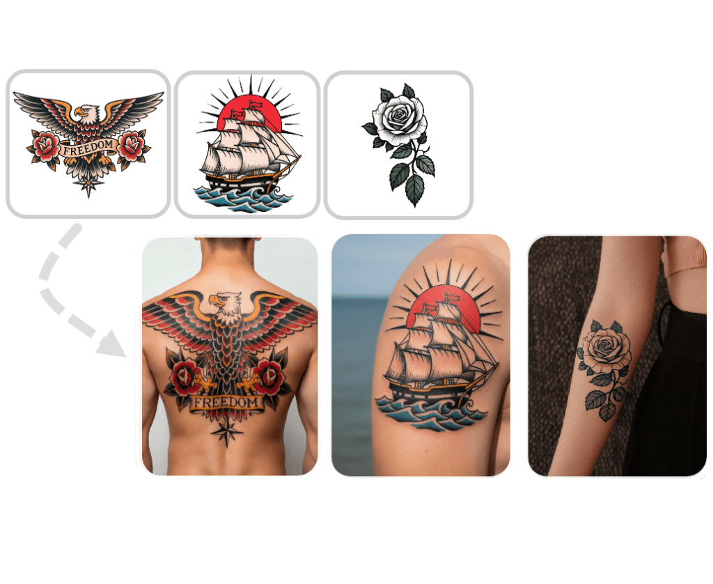 Design and visualize your tattoo all in one place. Turn your ideas into unique, custom tattoo designs with our AI Tattoo Generator – no drawing skills required – and instantly preview them on your body using the Virtual Try-On. Together, our AI-powered tools streamline the entire process, taking you from inspiration to a realistic final look with ease.